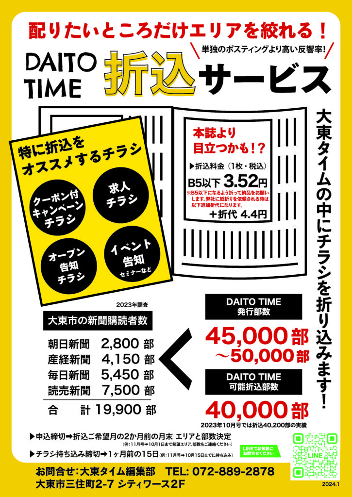 DAITOTIMEチラシ折込オプション kanrinin 1年前 DAITOTIMEにチラシを折込めば、最大4万部にチラシを入れることができます! 折り込むメリット 単独でポスティングするより破棄率が格段に低い 「DAITOTIME」と一緒に配布するので信頼性UP ポスティングの人件費と時間を節約できる。 お問い合わせ DAITOTIME編集部までお気軽のお問い合わせください。 TEL:070-9113-2662 共有: Facebook で共有 (新しいウィンドウで開きます) Facebook X で共有 (新しいウィンドウで開きます) X