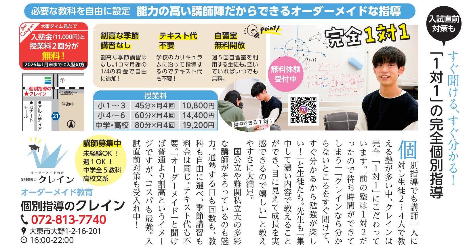 多くの個別指導塾が1人の講師に対し生徒2〜4人で教える中、クレインは完全「1対1」にこだわり。生徒は「分からないところをすぐ聞けて、すぐ理解できるから勉強が楽しい」と大好評。講師も「集中して教えられ、成長が目に見える」と指導のしやすさを実感しています。