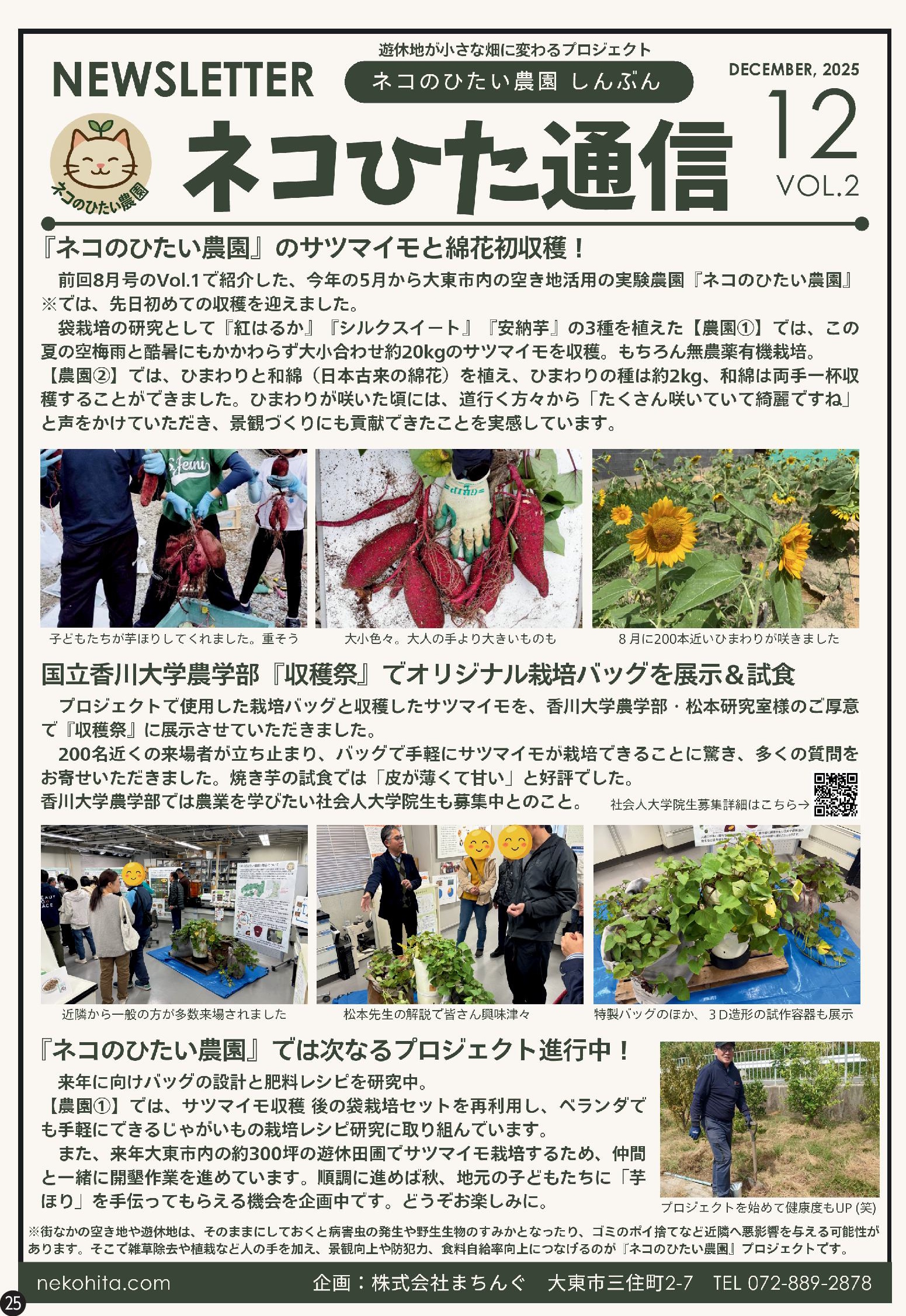 今年の5月から大東市内の空き地活用の実験農園「ネコのひたい農園」では先日初めての収穫を迎えました。