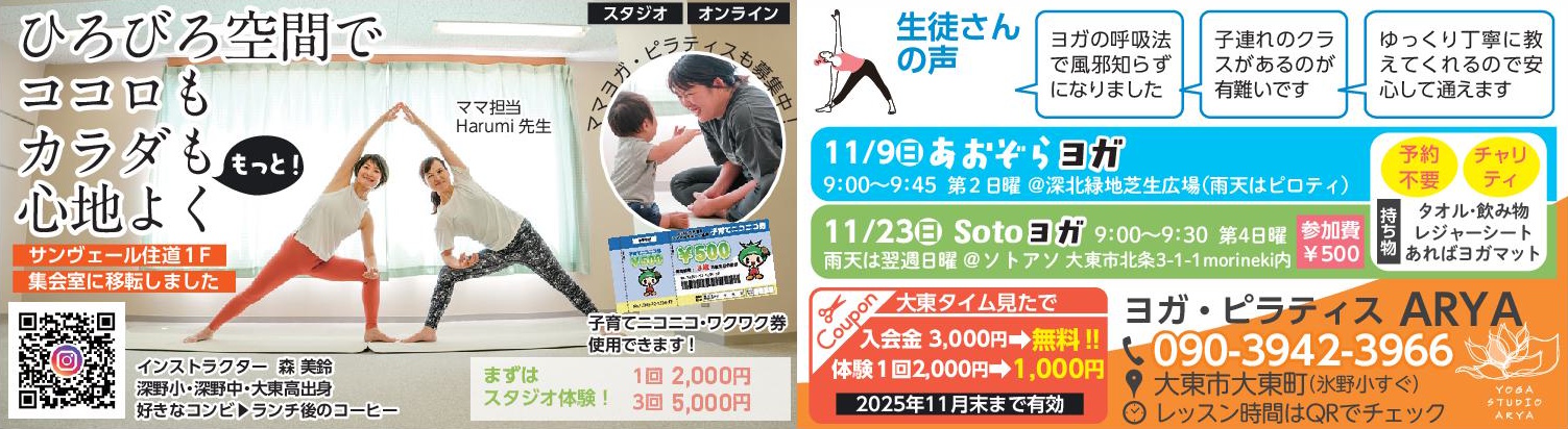 11月23日(日)Sotoヨガ 9:00~9:30 morineki(大東市北条3-1-1) 参加費500円