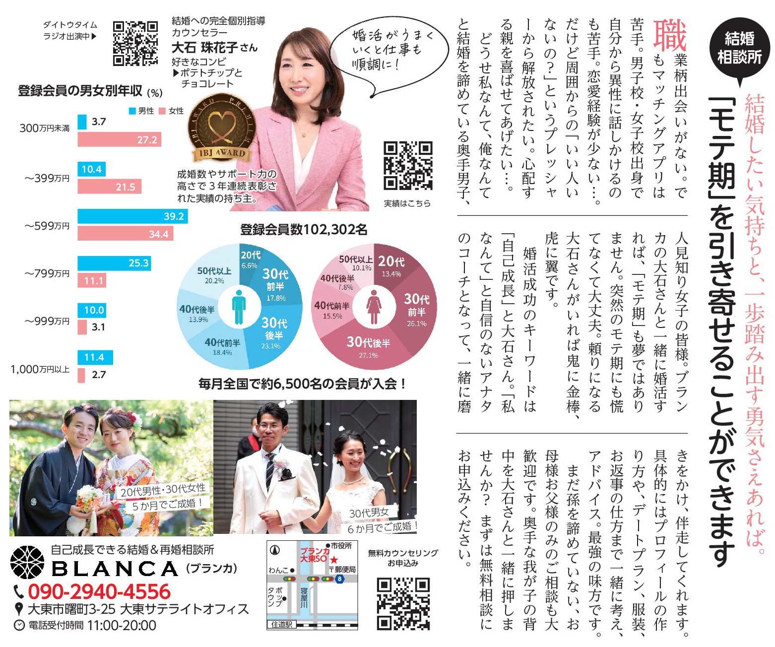 ブランカの 大石さん と一緒に婚活すれば、「モテ期」も夢ではありません。突然のモテ期でも、頼れる大石さんがそばにいれば 鬼に金棒、虎に翼 です。